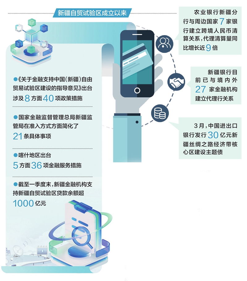 这是中国(新疆)自由贸易试验区推进跨境金融合作的一项最新成果。新疆自贸试验区挂牌以来,新疆金融监管部门及金融机构优化顶层设计,争取资源倾斜,创新金融产品,以金融活水浇灌自贸试验区茁壮成长。