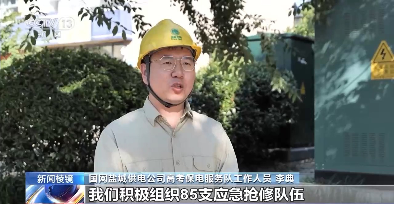 国网盐城供电公司高考保电服务队工作人员 李典:高考期间,我们积极组织85支应急抢修队伍、92台应急抢修车、237名应急值班人员,落实24小时值班制度,确保环网柜、箱变备品备件及时调用,助力广大学子迎战高考,金榜题名。