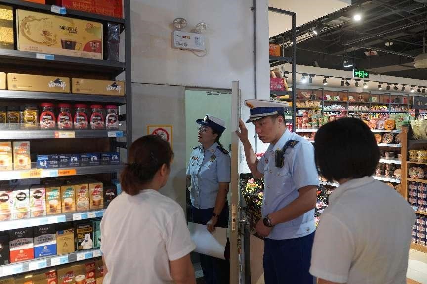 “这是安全出口,门口的这些纸箱子一定不能放在这里,会影响人员的疏散逃生。”哈密市消防救援支队消防监督员朱焕国边检查边叮嘱。