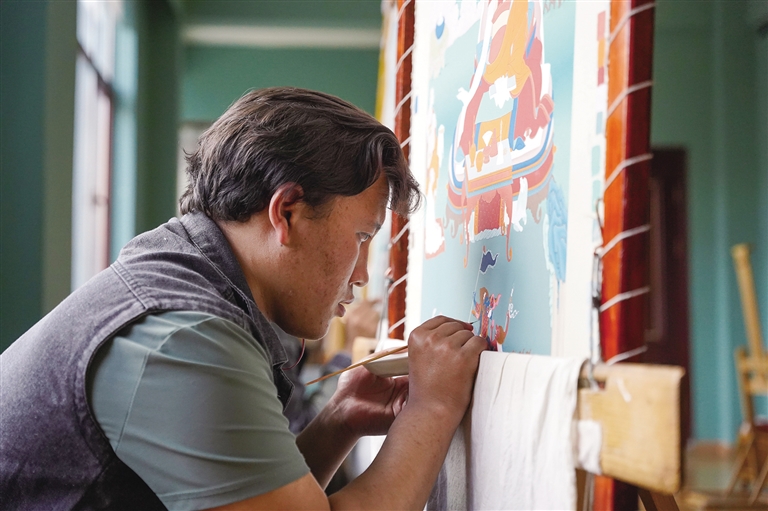 夏日午后,记者驱车抵达西藏嘎钦唐卡画院。在这里,我们见到了昌都嘎玛嘎赤画派的传承人罗珠巴松,他给人的第一印象是斯文腼腆。然而,更令人惊讶的是,眼前这位年轻的唐卡画师已经被认定为国家级非遗传承人——今年2月,文化和旅游部公示了第六批国家级非物质文化遗产代表性传承人推荐人选名单,罗珠巴松作为藏族唐卡(昌都嘎玛嘎赤画派)的代表性传承人入选。