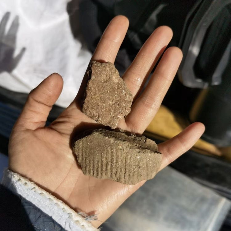 那是在周口店遗址对面的台地上,小团队一致认为,靠山、面水、朝阳的天然优势给了古人在此栖息的充足理由。李静捡到的第一件文物标本是一块褐色陶片,比大拇指稍宽,但表面压印的绳纹格外醒目,连同在手里抚摸到的粗糙感,让她坚信它一定年代久远。