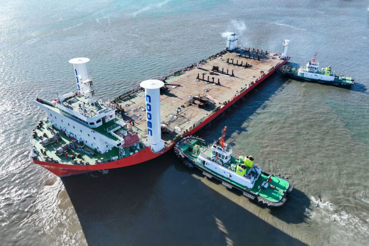 图为我国自主研发制造的船用风力旋筒助推系统在船只上投用(受访者供图)