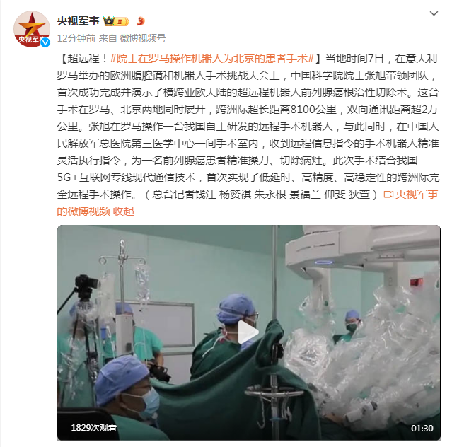 当地时间7日,在意大利罗马举办的欧洲腹腔镜和机器人手术挑战大会上,中国科学院院士张旭带领团队,首次成功完成并演示了横跨亚欧大陆的超远程机器人前列腺癌根治性切除术。这台手术在罗马、北京两地同时展开,跨洲际超长距离8100公里,双向通讯距离超2万公里。张旭在罗马操作一台我国自主研发的远程手术机器人,与此同时,在中国人民解放军总医院第三医学中心一间手术室内,收到远程信息指令的手术机器人精准灵活执行指令,为一名前列腺癌患者精准操刀、切除病灶。此次手术结合我国5G+互联网专线现代通信技术,首次实现了低延时、高精度、高稳定性的跨洲际完全远程手术操作。(总台记者钱江 杨赞祺 朱永根 景福兰 仰斐 狄萱)
