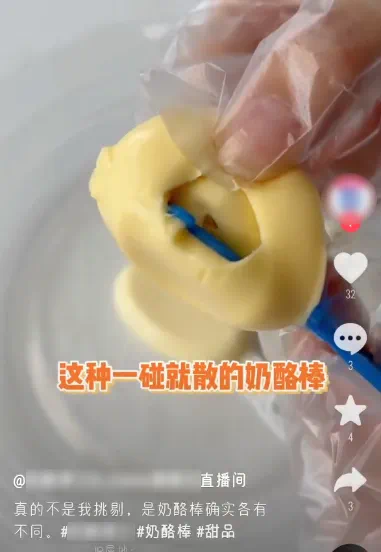 “这种一碰就是水的奶酪棒你买过吗?像我们家这种牛奶代替水的,口感非常绵密。因为干酪的含量很高……”在某网络直播间,一个奶酪棒公司主播拿着另一款奶酪产品向观众这样介绍。