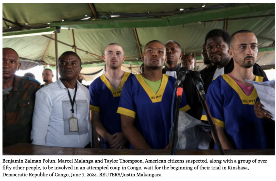 据路透社9日消息,周五,参与刚果(金)未遂政变53名嫌疑人在首都金沙萨出庭,其中包括6名美国、英国、加拿大和比利时公民。