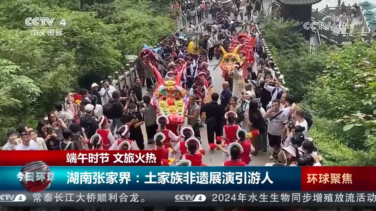 在湖南张家界,一场土家族的“梭地龙”非遗展演巡游让现场游客大饱眼福。巡游中,百名民间艺人一起舞动由“土家织锦”“土家刺绣”“土家蜡染”做成的三条“梭地龙”,沿着天梯拾级而上,为游客送上最真挚的节日祝福,不少游人也加入表演队伍中,舞龙头、摸龙尾、沾龙气,体验非遗的无限魅力。