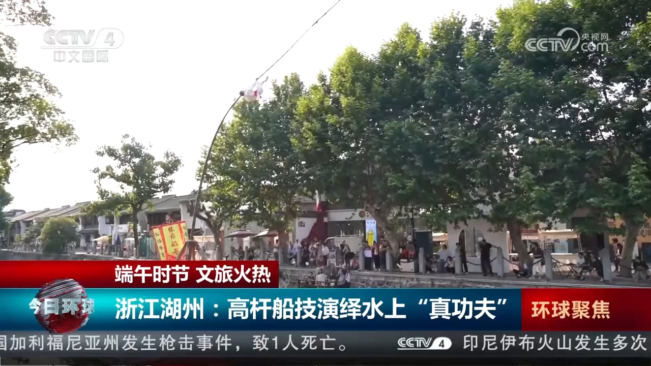 端午假期,浙江湖州南浔的练溪河热闹非凡,这里每天都会上演练市船拳和高杆船技的非遗表演。船在河中行,杆在船上立,人在杆上翻,表演者仅凭一根高杆,时而倒立,时而凌空翻飞,在十余米的空中不断变换着动作,这就是杭嘉湖地区的“高杆船技”。表演者双手握着高杆,每一个动作都精准流畅,引得岸边观众连连叫好。