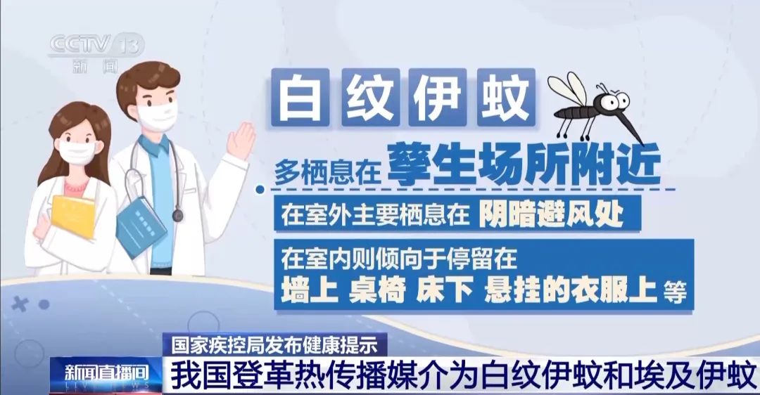 中国卫生有害生物防制协会会长 梁晓峰:主要症状还是发热,所以一旦不明原因地发热或者被蚊虫叮咬以后,要意识到有可能是登革热。一旦有这类症状,要尽早就医,不能扛着。我们要去一些发热门诊、医疗机构,做一些检查,尽早确诊对治疗会很有帮助。