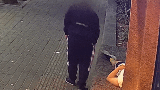 此时路上还有行人。只见一名头戴鸭舌帽、身穿深色休闲服的男子大摇大摆地走过来。他环顾四周后,见无人留意,便在醉酒男子身侧坐下,摸到手机后迅速离开现场。