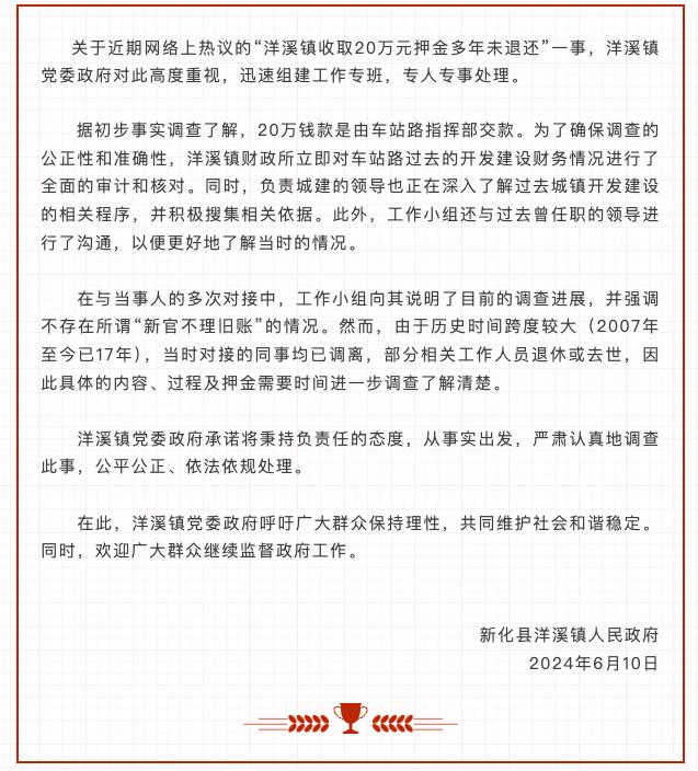 央视网消息: 据平安洋溪公众号消息,湖南新化县洋溪镇人民政府就近期网络上热议的“洋溪镇收取20万元押金多年未退还”一事发布声明称,据初步事实调查了解,20万钱款是由车站路指挥部交款。为了确保调查的公正性和准确性,洋溪镇财政所立即对车站路过去的开发建设财务情况进行了全面的审计和核对。同时,负责城建的领导也正在深入了解过去城镇开发建设的相关程序,并积极搜集相关依据。此外,工作小组还与过去曾任职的领导进行了沟通,以便更好地了解当时的情况。在与当事人的多次对接中,工作小组向其说明了目前的调查进展,并强调不存在所谓“新官不理旧账”的情况。然而,由于历史时间跨度较大(2007年至今已17年),当时对接的同事均已调离,部分相关工作人员退休或去世,因此具体的内容、过程及押金需要时间进一步调查了解清楚。