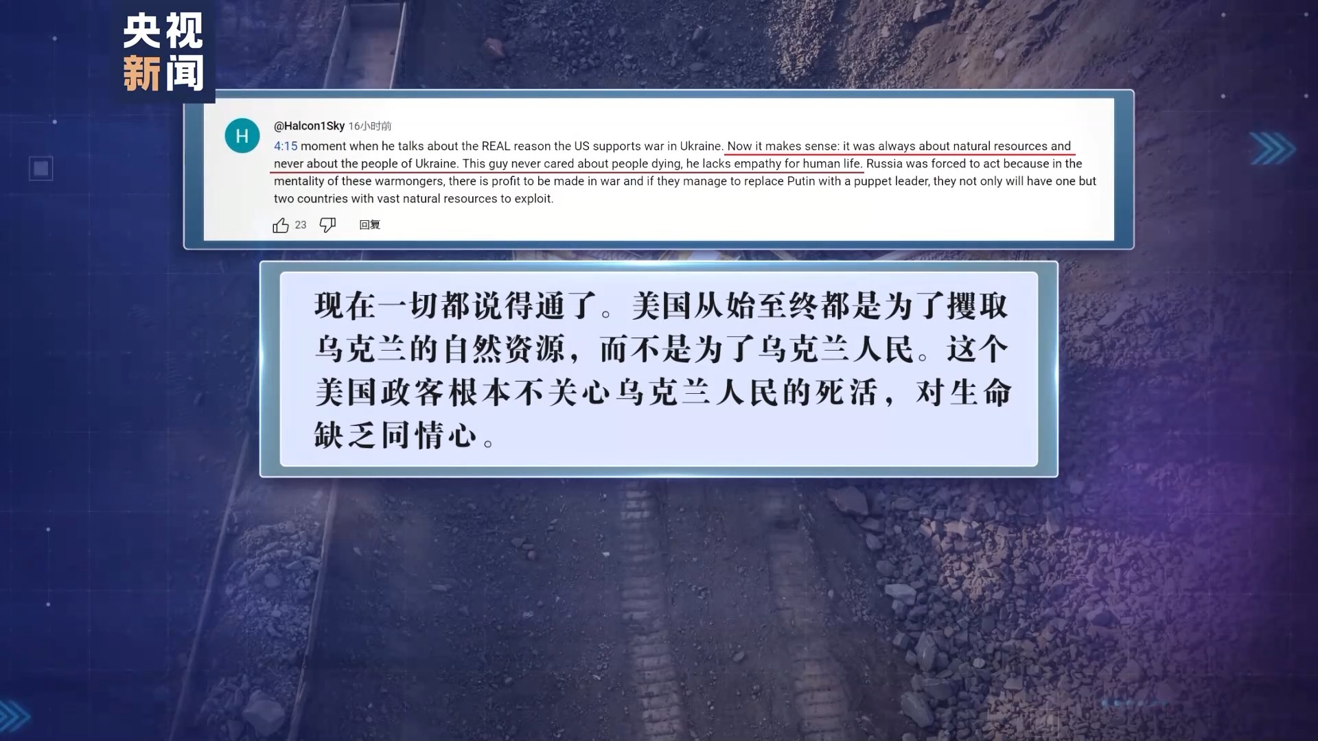 网友:现在一切都说得通了。美国从始至终都是为了攫取乌克兰的自然资源,而不是为了乌克兰人民。这个美国政客根本不关心乌克兰人民的死活,对生命缺乏同情心。