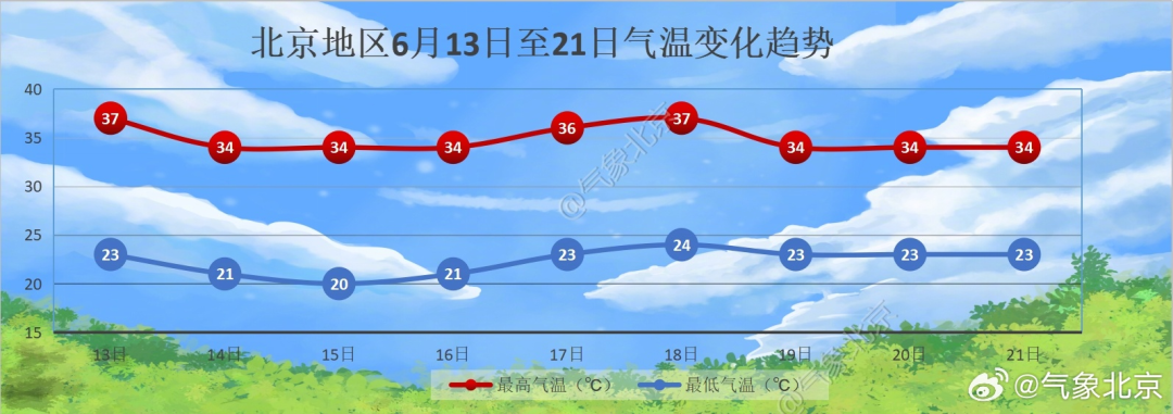 预计从6月13日至21日南郊观象台最高气温为34℃至37℃,最低气温20℃至24℃。