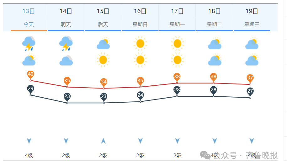 最高气温:济南、淄博、潍坊、菏泽、济宁和鲁西北地区40~42℃,沿海地区30~35℃,其他地区37~39℃。