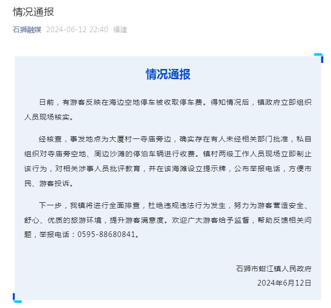 经核查,事发地点为大厦村一寺庙旁边,确实存在有人未经相关部门批准,私自组织对寺庙旁空地、周边沙滩的停泊车辆进行收费。镇村两级工作人员现场立即制止该行为,对相关涉事人员批评教育,并在该海滩设立提示牌,公布举报电话,方便市民、游客投诉。
