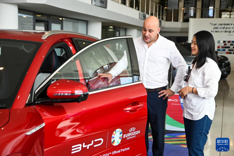 2024年5月29日,在马耳他比尔基卡拉,马耳他哈桑-扎米特汽车公司首席执行官德古阿拉(左)介绍一辆比亚迪纯电动汽车。新华社发(乔纳森·博格 摄)