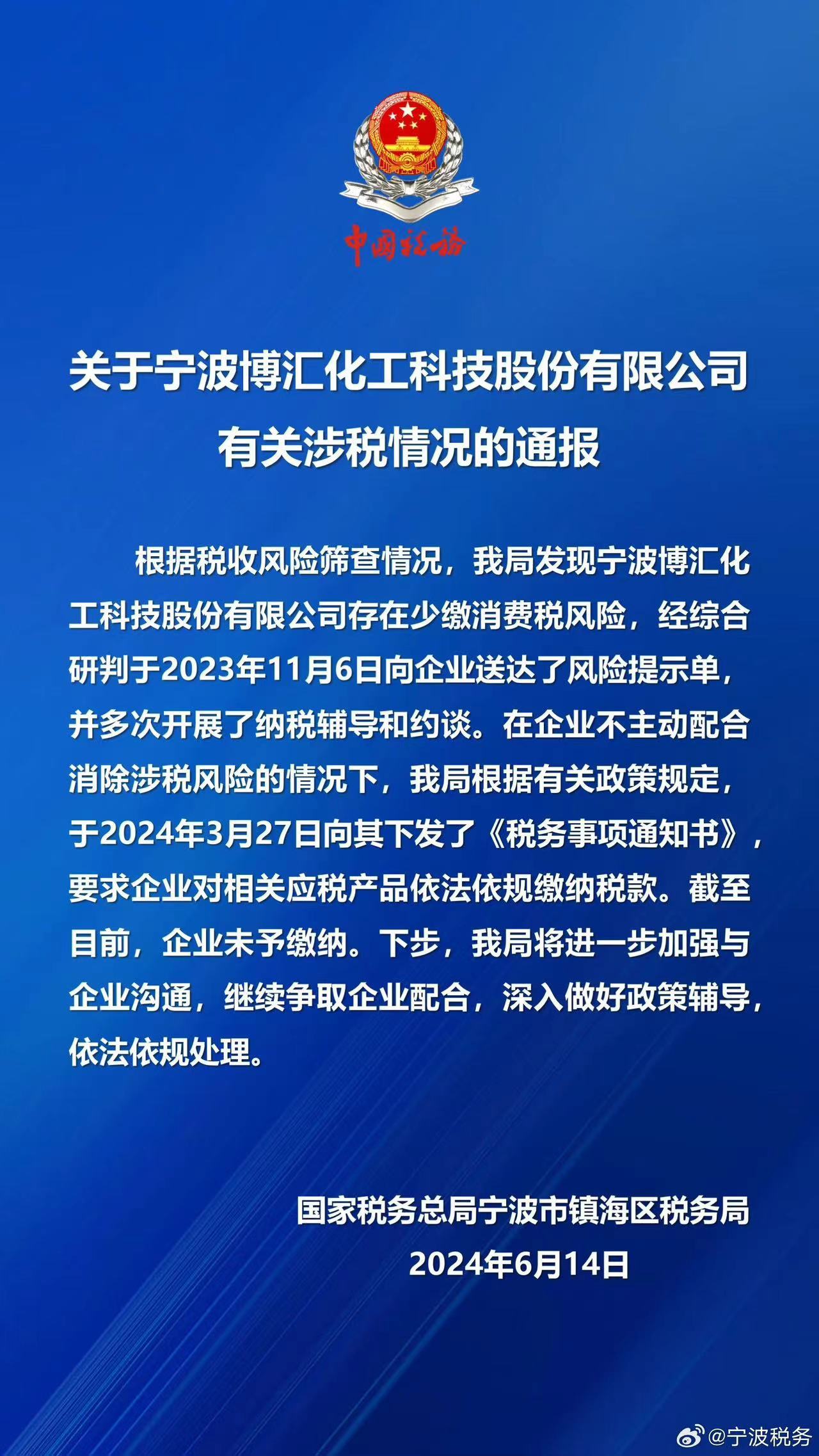 6月14日晚间,国家税务总局宁波市镇海区税务局发布通报称,根据税收风险筛查情况,发现博汇股份存在少缴消费税风险,并多次开展了纳税辅导和约谈。截至目前,企业未予缴纳。该局将进一步加强与企业沟通,继续争取企业配合,深入做好政策辅导,依法依规处理。