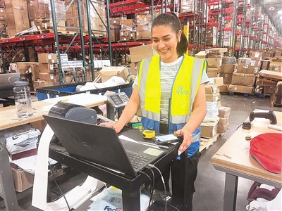 在位于美国新泽西的海外仓内,杰西卡·卡斯蒂罗正在电脑前工作。孙伊豆摄