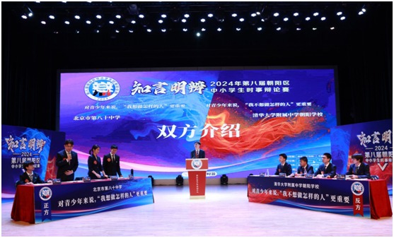 本届比赛由朝阳区教育委员会主办、朝阳区青少年活动中心承办,以“知言明辨”为主题,学生们围绕“校园暴力” “人工智能” “淄博烧烤” “文化出海” “生成式AI”等社会热点话题进行了激烈辩论。比赛历时两个多月,全区92支辩论队完成了初赛、复赛、半决赛89场比赛的激烈角逐,最终小学组北京工业大学附属中学(首城国际校区)、中国科学院附属实验学校,初中组北京市朝阳外国语学校、北京中学一分校,高中组北京市第八十中学、清华大学附属中学朝阳学校等6支代表队晋级到了总决赛。