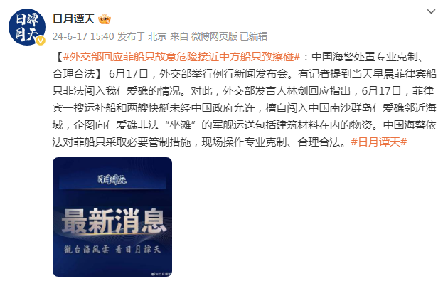 6月17日,外交部举行例行新闻发布会。有记者提到当天早晨菲律宾船只非法闯入我仁爱礁的情况。对此,外交部发言人林剑回应指出,6月17日,菲律宾一艘运补船和两艘快艇未经中国政府允许,擅自闯入中国南沙群岛仁爱礁邻近海域,企图向仁爱礁非法“坐滩”的军舰运送包括建筑材料在内的物资。中国海警依法对菲船只采取必要管制措施,现场操作专业克制、合理合法。
