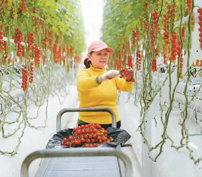 无土栽培、智能控温、水肥一体……近日,位于四川省南充市高坪区的中法农业科技园全气候智能温室内,圆润鲜亮的小番茄挂满秧藤,滴灌系统不断给小番茄“投喂”,工人乘轨道车穿梭在2万余平方米的小番茄林,忙着采摘、分拣鲜果,一幅“工厂化”的现代农业景象展现在眼前。