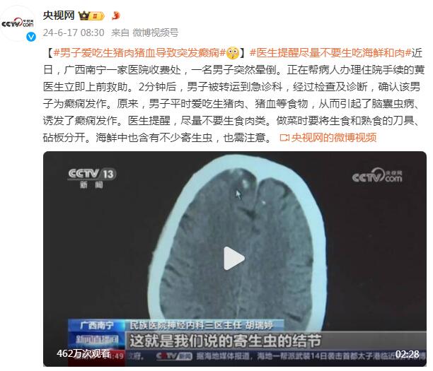 近日,广西南宁一家医院收费处,一名男子突然晕倒。正在帮病人办理住院手续的黄医生立即上前救助。2分钟后,男子被转运到急诊科,经过检查及诊断,确认该男子为癫痫发作。原来,男子平时爱吃生猪肉、猪血等食物,从而引起了脑囊虫病、诱发了癫痫发作。医生提醒,尽量不要生食肉类。做菜时要将生食和熟食的刀具、砧板分开。海鲜中也含有不少寄生虫,也需注意。