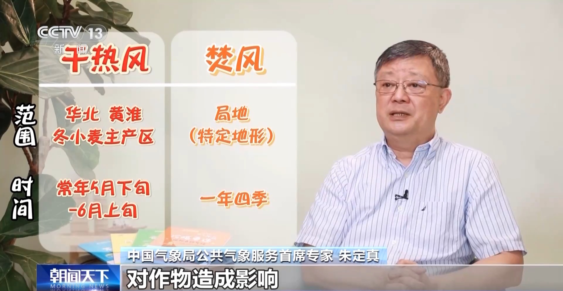 中国气象局公共气象服务首席专家 朱定真:干热风和焚风,实际上讲的都是一种气温高、湿度低的一种风,而形成一些灾害。