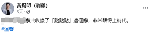 岛内资深媒体人黄扬明日前在社交平台脸书贴出台当局“教育部”“重编国语辞典修订本”网站截图,并称辞典收录了“点点点”这个词,“非常跟得上时代”。台媒报道称,黄扬明在文末还附注“温馨”二字,讽刺意味十足。