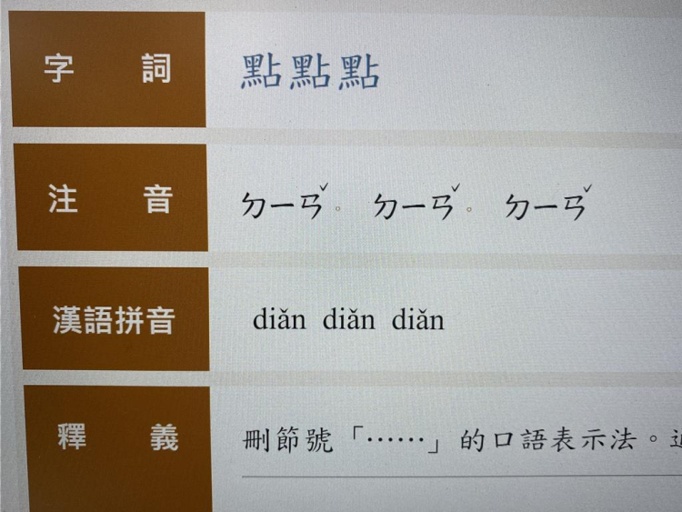 【环球网报道】据台湾中时新闻网6月18日报道,台教育部门“国语辞典”被视为用字使用准则,但常用的省略号“……”被发现竟变成词语“点点点”,被收录在网站内,并列出不当例句,引发争议。岛内媒体人郑师诚表示,台教育部门要“去中国化”也想点别的点子,不要把好的精华拿出来,把垃圾塞进去,让小孩子以后不知所云。据报道,台教育部门疑因网友骂声不断,事后已把有争议的例句删除。