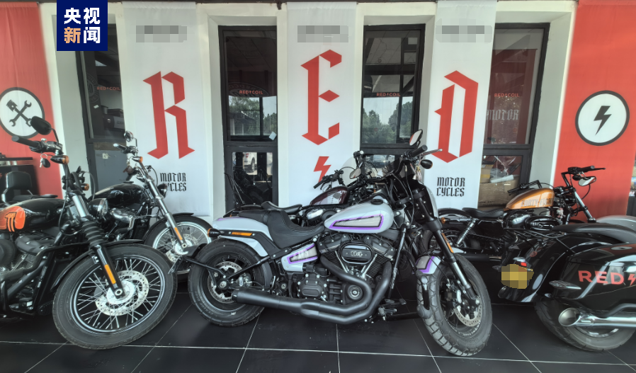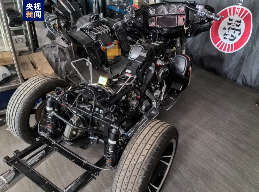 在改装门店内,停放着十余辆各式各样的摩托车,部分车辆排气系统已经经过改装,工作区摆放着各种改装工具,再往门店内部走还有几辆摩托车被拆得几乎只剩车架,库房货架上也摆满了各式各样的摩托车零配件。