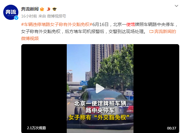 6月16日,北京一使馆牌照车辆路中央停车,女子称有外交豁免权,后方堵车司机报警后,交警到达现场处理。