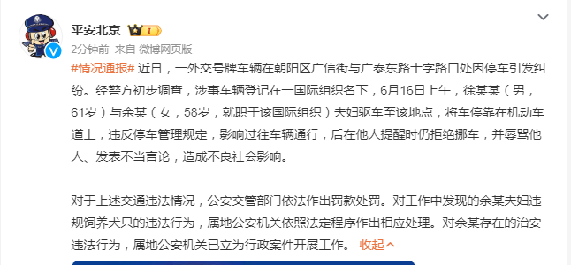 据@平安北京微博消息,近日,一外交号牌车辆在朝阳区广信街与广泰东路十字路口处因停车引发纠纷。经警方初步调查,涉事车辆登记在一国际组织名下,6月16日上午,徐某某(男,61岁)与余某(女,58岁,就职于该国际组织)夫妇驱车至该地点,将车停靠在机动车道上,违反停车管理规定,影响过往车辆通行,后在他人提醒时仍拒绝挪车,并辱骂他人、发表不当言论,造成不良社会影响。
