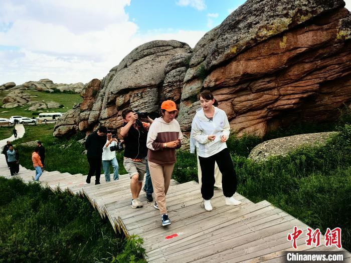 在草原石城景区,图兰电视台摄像记者别克江·巴依肯杰夫一一拍下形状各异的巨石,还摆出各种姿势自拍。