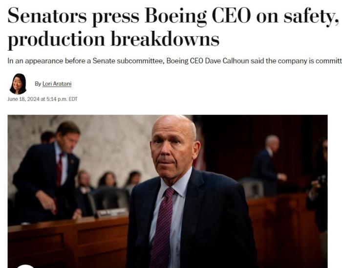 据美国《华盛顿邮报》报道,就在卡尔霍恩接受质询的前不久,参议院委员会发布了一份报告,称波音公司“丢失了数百份关于不合格的飞机零部件的记录,裁掉了质量检查员,并让制造工人负责签署自己的工作”。议员们还表示,这些发现与波音公司将安全放在首位的保证存在矛盾。