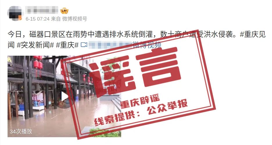 近日,有网民在社交平台发帖称,“磁器口景区在雨势中遭遇排水系统倒灌,数十商户遭受洪水侵袭”,并配发磁器口景区内涝视频。经沙坪坝区相关部门核实,网传信息系“旧闻翻炒”的谣言。