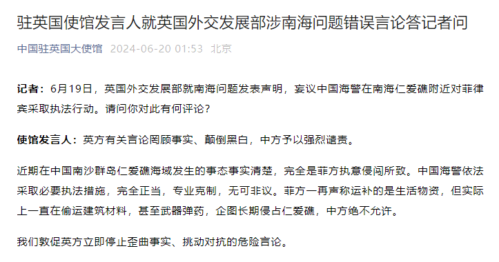 记者:6月19日,英国外交发展部就南海问题发表声明,妄议中国海警在南海仁爱礁附近对菲律宾采取执法行动。请问你对此有何评论?