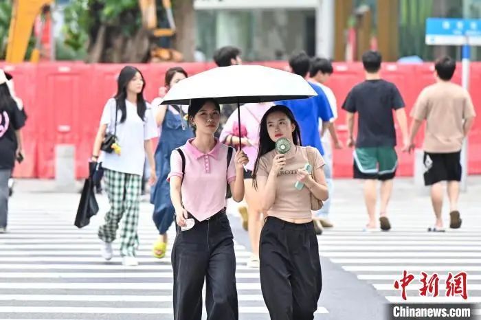 6月13日,广东广州,市民手持风扇与雨伞散热降温。陈骥旻 摄