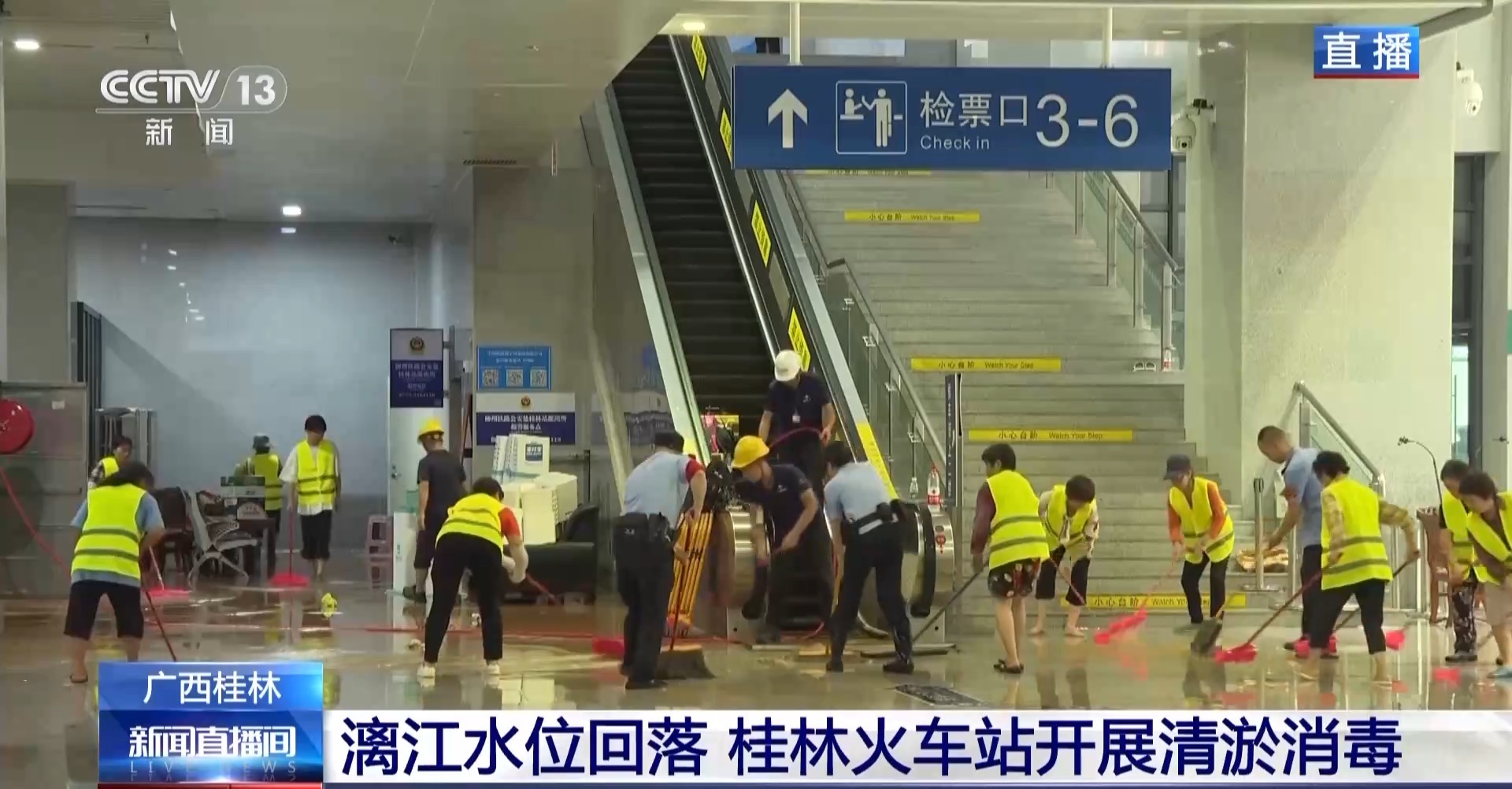 今天,随着漓江水位下降,桂林市的内涝情况得到很大缓解。桂林火车站除了一些站内的站台通道,其他地方都已经没有积水了,但是留下了很多淤泥。工作人员正开展清淤消毒、设备检修等工作。南宁铁路局还从各部门调派100多人参与到相关工作中。