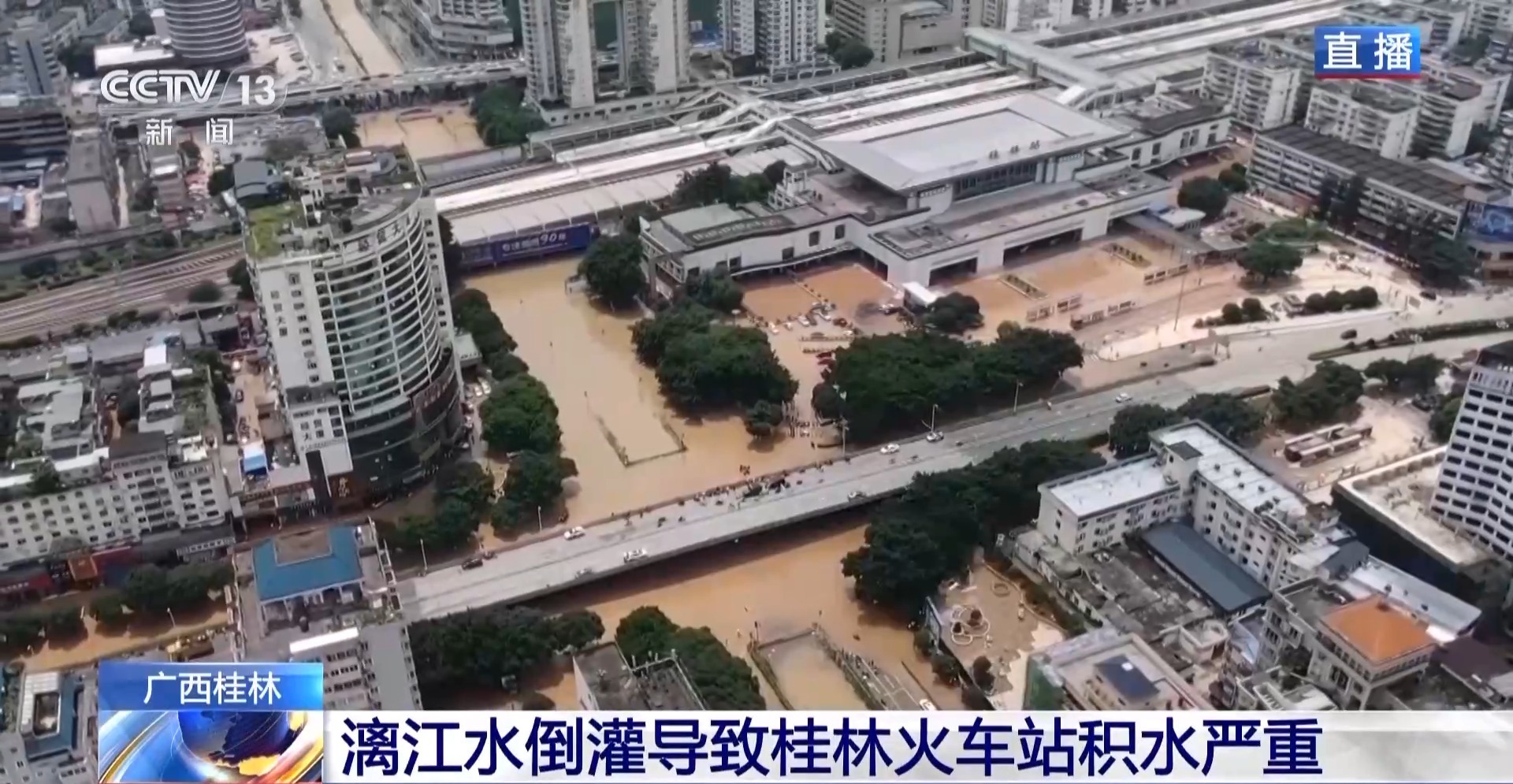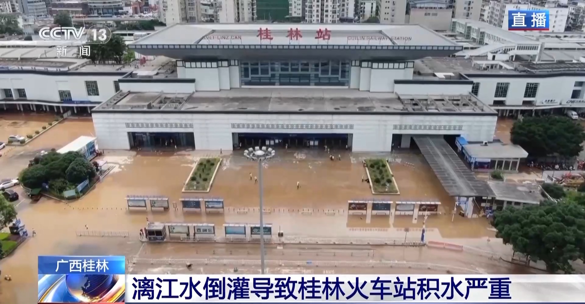 总台记者 许大为:目前,桂林火车站站前广场还有很多淤泥,通过航拍看到,附近低洼区仍有一些积水,影响交通出行。