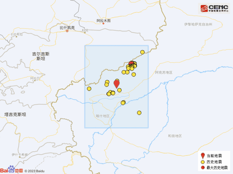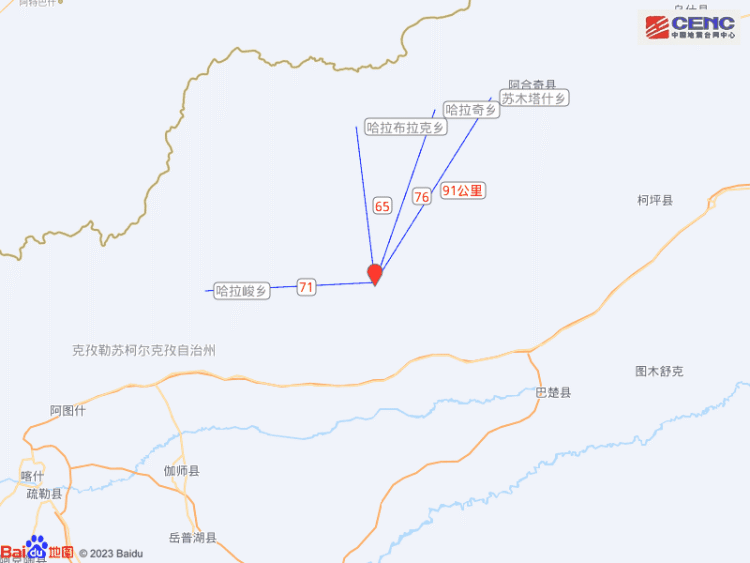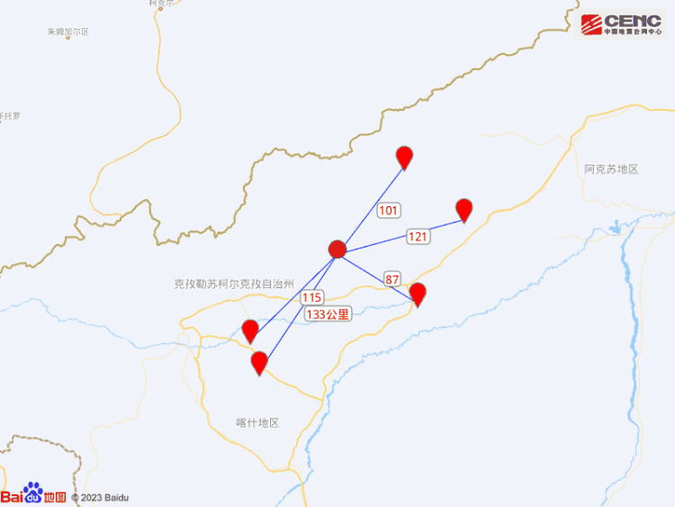 周边县城: 震中距巴楚县87公里、距阿合奇县101公里、距伽师县115公里、距柯坪县121公里、距岳普湖县133公里,距图木舒克市125公里,距乌鲁木齐市914公里。