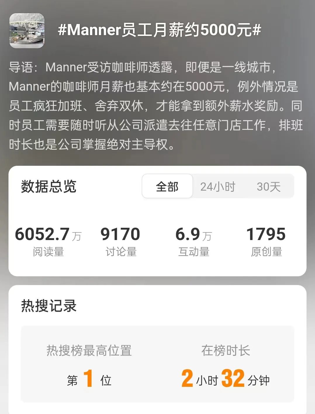 今日#Manner员工月薪约5000元#登上微博热搜榜一