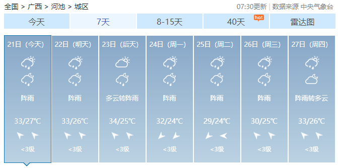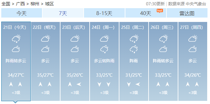 21日白天,百色、河池、柳州、桂林、防城港等市有小到中雨、局地大雨到暴雨,其他地区多云有阵雨或雷雨、局地大雨。