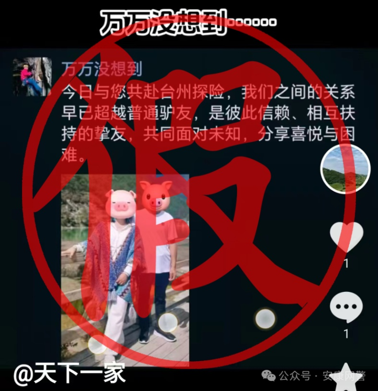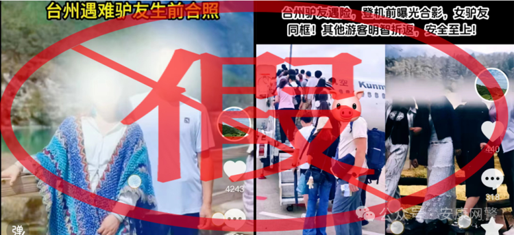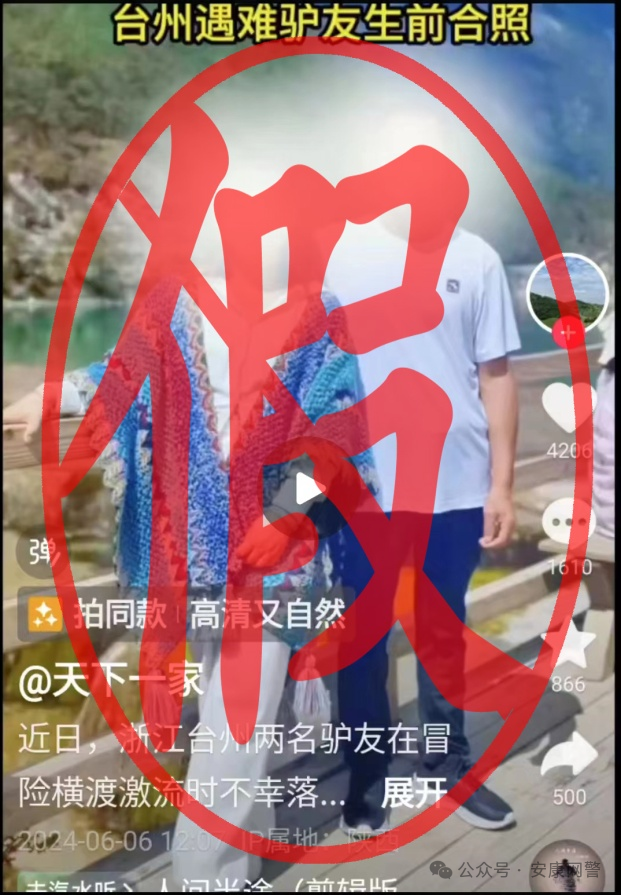 6月9日,熊女士来到陕西安康岚皋县公安局报警称,其姐姐和父亲外出旅游时拍的照片被他人发布在短视频平台,还配有“台州遇难驴友生前合照”“台州驴友遇险,登机前曝光合影”等虚假信息。