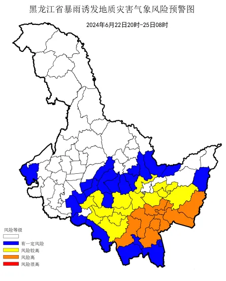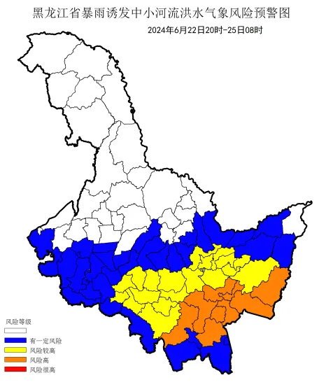 黑龙江省人民政府防汛抗旱指挥部办公室、黑龙江省水利厅、黑龙江省气象局6月22日15时00分联合发布中小河流洪水气象风险预警: 预计6月22日20时—25日08时,七台河全区,鸡西全区,海林、林口、穆棱发生中小河流洪水的气象风险高(橙色预警) ,哈尔滨、呼兰、巴彦、木兰、通河、方正、依兰、宾县、阿城、尚志、延寿、汤原、佳木斯、桦川、桦南、双鸭山、集贤、友谊、宝清发生中小河流洪水的气象风险较高(黄色预警) ,龙江、泰来、大庆全区、明水、青冈、望奎、绥棱、安达、兰西、肇东、北林、庆安、铁力、大箐山、南岔、金林、鹤岗全区、富锦、同江、饶河、五常、双城、牡丹江、宁安、绥芬河、东宁有一定气象风险引发中小河流洪水(蓝色预警) 。请上述地区做好中小河流洪水的实时监测、防汛预警、巡查防守、转移避险和抢险救援等防范工作。