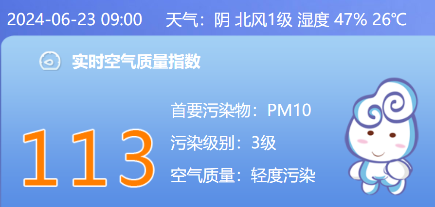 据北京市生态环境监测中心,截至6月23日9时,北京实时空气质量指数113,首要污染物为PM10,空气质量为轻度污染。