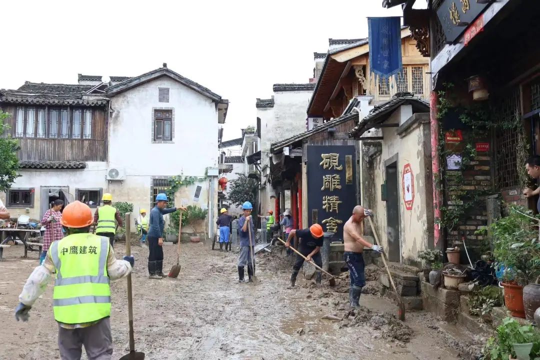 在渔梁古镇老街,清淤工作正在紧张进行中。从附近招募来的工人推着小推车,清理巷子里的淤泥,原本的鹅卵石路面被黑泥覆盖。由于巷子狭窄,清理完一车后,需要用小推车推出来,再倒进三轮车中运走。