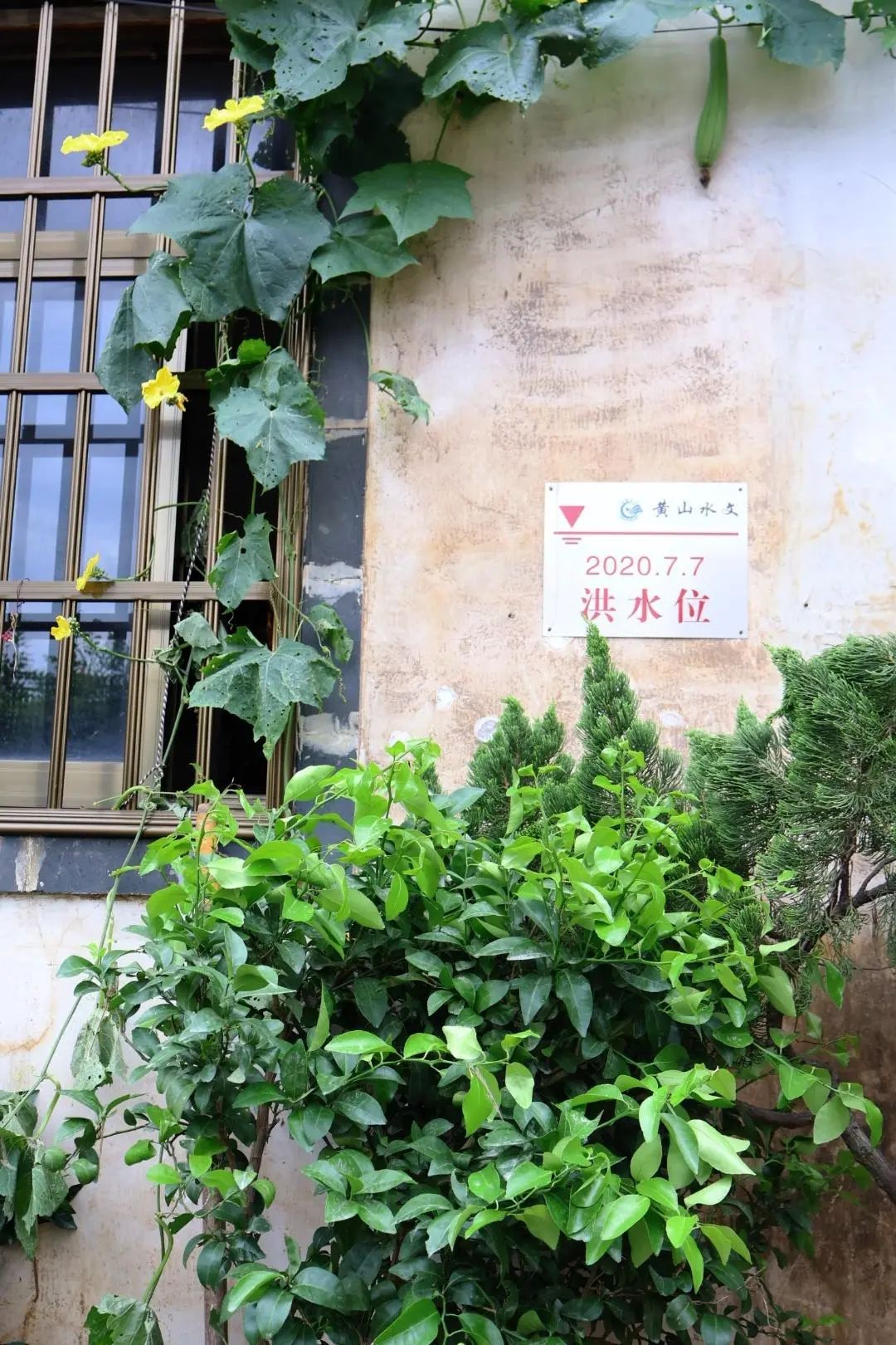 九派新闻注意到,在紧邻江畔的一座房屋外墙上,标注着2020年7月7日的洪水位。墙上搭了一个丝瓜架,绿叶蔓延,垂下一个小小的丝瓜。20日洪水退去后留下的泥痕几乎与丝瓜架齐平,高于黄山水文标注的洪水位。一位正在附近运送淤泥的司机称,本次洪水,这里的最高水位,比2020年高出近30公分。