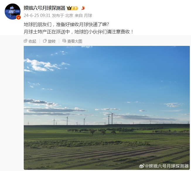 刚刚,@嫦娥六号月球探测器 发博:“月球土特产正在派送中,地球的小伙伴们请注意查收!”嫦娥六号欢迎回家,我们期待来自月球的快递!