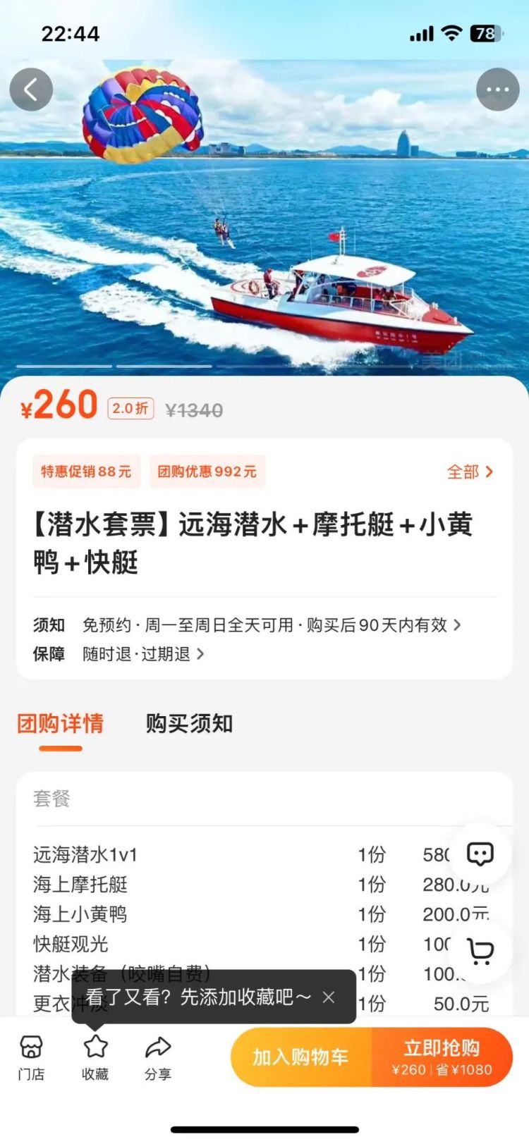 记者来到三亚玛瑞纳酒店码头,展板上写着“潜水380元一位”,通过互联网卖家的介绍,一位摆摊的商家说,交费260元,就可以玩潜水、摩托艇、小黄鸭。