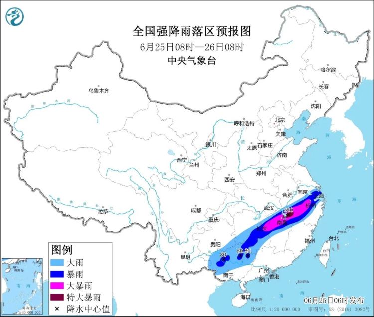 6月25日08时至26日08时,苏皖南部、上海南部、浙江北部、江西中北部、湖南中部、广西西部和北部等地部分地区有暴雨,其中,安徽南部、湖南东部、江西中北部、浙江西部等地部分地区有大暴雨,江西北部局地特大暴雨(250~260毫米)。上述部分地区伴有短时强降水(最大小时降雨量30~50毫米,局地可超过70毫米),局地有雷暴大风等强对流天气。