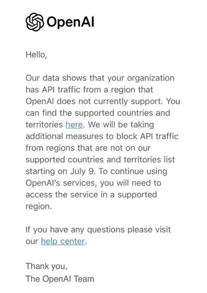 从昨天晚间至今,已有多名用户收到了来自OpenAI的邮件。该邮件表示,“我们的数据显示您的组织来自OpenAI目前不支持的地区的API流量。”邮件进一步表示,自7月9日起,OpenAI将开始阻止来自非支持国家和地区的API流量。受影响组织若希望继续使用OpenAI的服务,必须在其支持的国家或地区内访问。